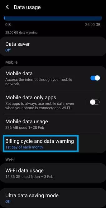 You will have two choices available to you here. You will receive a notification if the Set Data Warning option is turned on after using up a certain amount of mobile data. The Set Data Limit option, on the other hand, will prevent you from using mobile data at all after you reach the predetermined limit.